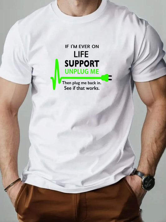 100 Percent Cotton Mens Round Neck T Shirt Life Support Unplug Socket Graphic Print Breathable Casual Oversized Tee