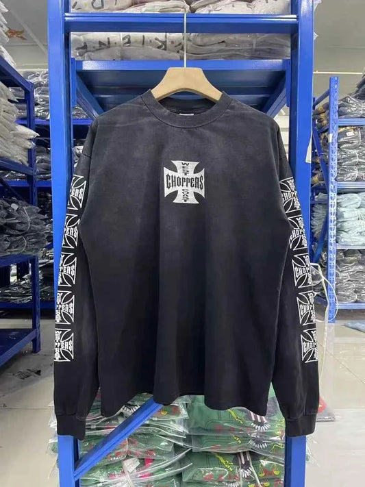 Mens West Coast Choppers Cross Print Loose Pullover Long Sleeve Vintage Washed Casual T Shirt